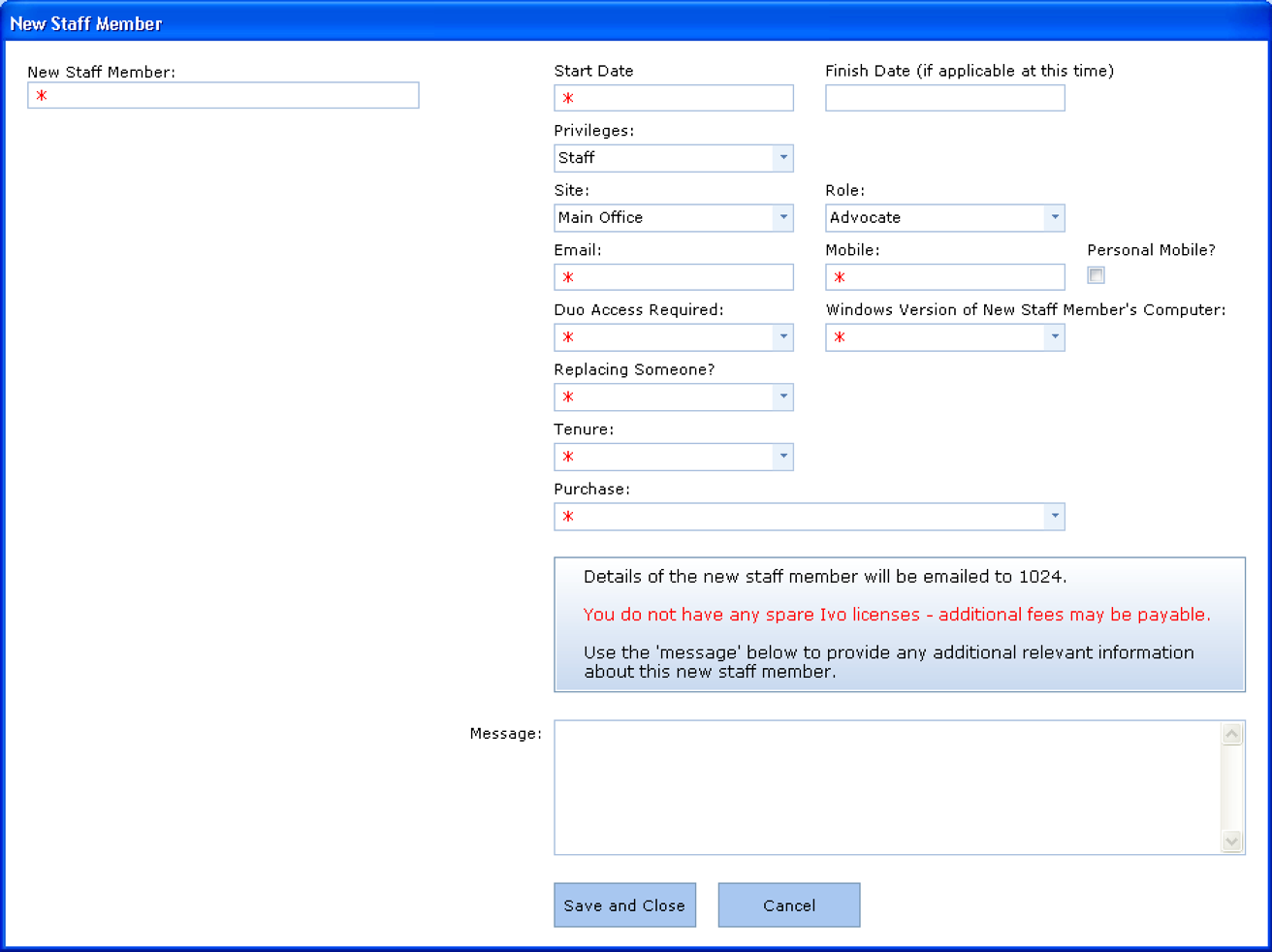 Some fields may be different depending on your organisation's configuration. - Please include a message with any relevant details about the new staff member, such as whether they are replacing another staff member (and if so, how long the 'handover' period is), whether they are temporary etc.