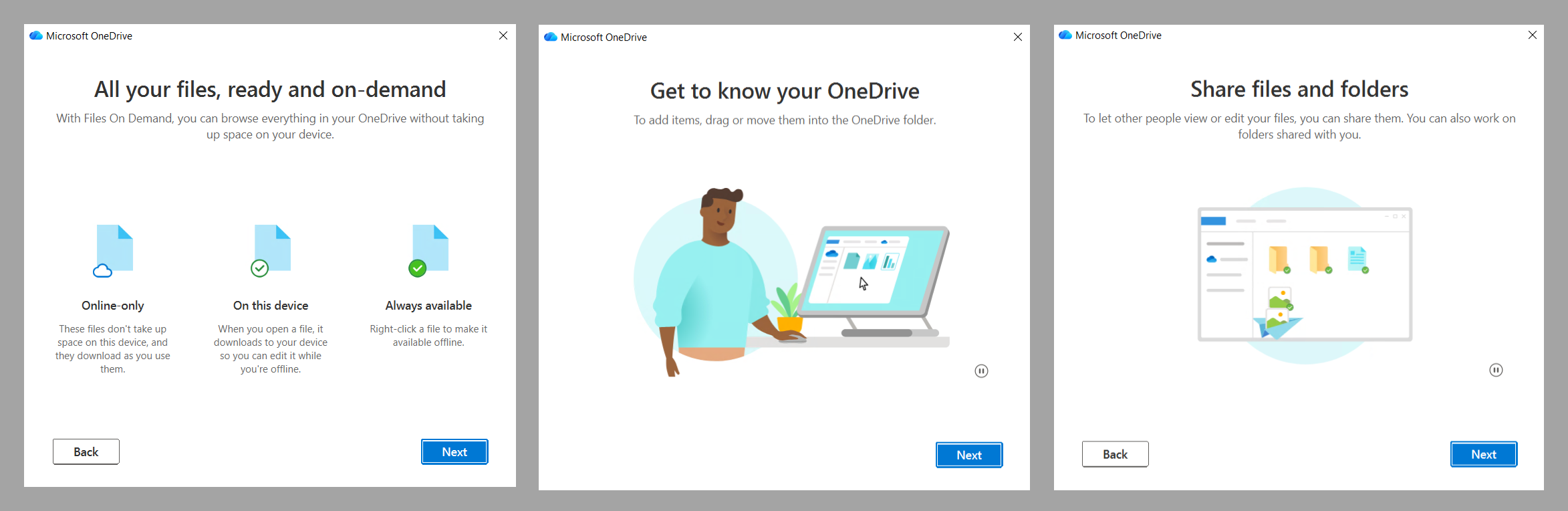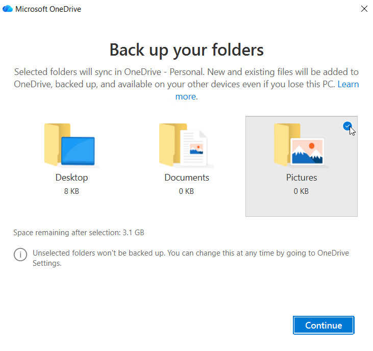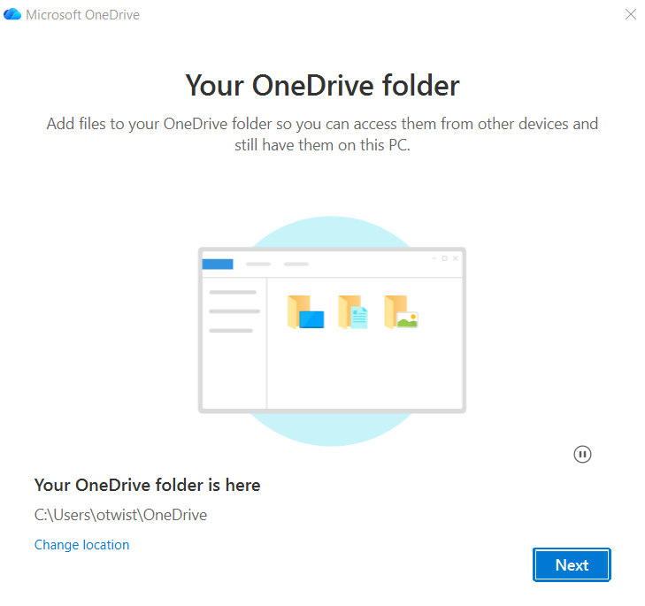 5. At the OneDrive folder notification step, click "Next" in the bottom right corner.