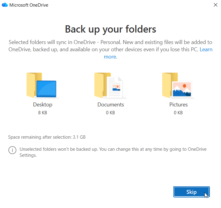 Once you've deselected all folders, click on "Skip" in the bottom right corner to move to the next window.