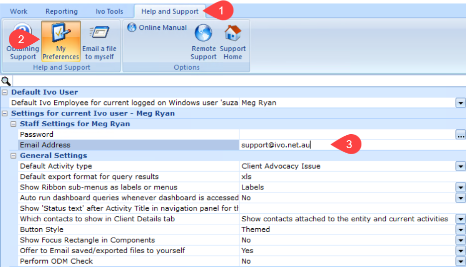 To do so, go to the Help & Support tab > click on the My Preferences button on the Toolbar > Enter your email address (if not already there) under the 'Staff Settings for <username>'.